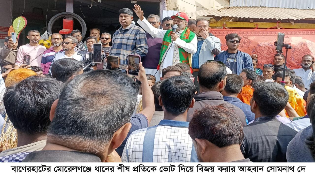 পথসভায় প্রধান অতিথির বক্তব্যে বাগেরহাট-৪ আসনের বিএনপির মনোনীত প্রার্থী সোমনাথ দে বলেন, “বিএনপির চেয়ারম্যান তারেক রহমানের ধানের শীষ প্রতিকে ভোট দিলে মোরেলগঞ্জ-শরণখোলা আধুনিক উপজেলা হিসেবে গড়ে উঠবে। প্রতিটি ইউনিয়ন হবে মডেল ইউনিয়ন, পৌরসভা হবে দেশের দৃশ্যমান পৌরসভা।”