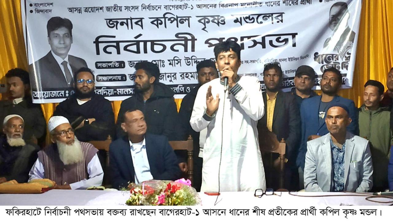 বাগেরহাটের ফকিরহাটে বিএনপির উদ্যোগে ধানের শীষ প্রতীকের নির্বাচনী পথসভা অনুষ্ঠিত হয়েছে। শুক্রবার (৬ ফেব্রুয়ারি) সন্ধ্যা ৭টায় উপজেলার হোচলা মাঠে আয়োজিত সভায় প্রধান বক্তা ছিলেন বাগেরহাট-১ আসন (ফকিরহাট-মোল্লাহাট-চিতলমারী) থেকে বিএনপির মনোনীত প্রার্থী কপিল কৃষ্ণ মন্ডল।