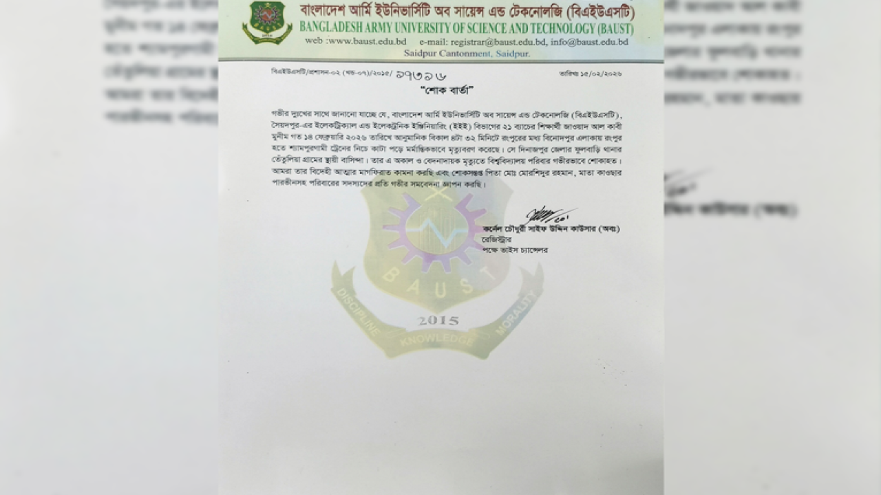 নীলফামারীর সৈয়দপুরে অবস্থিত বাংলাদেশ আর্মি ইউনিভার্সিটি অব সায়েন্স অ্যান্ড টেকনোলজি (বাউস্ট)-এর শিক্ষার্থী জাওয়াদ আলকাবী মুনীমের (২৩) আত্মহত্যায় গভীর শোক প্রকাশ করেছে বিশ্ববিদ্যালয় কর্তৃপক্ষ।
