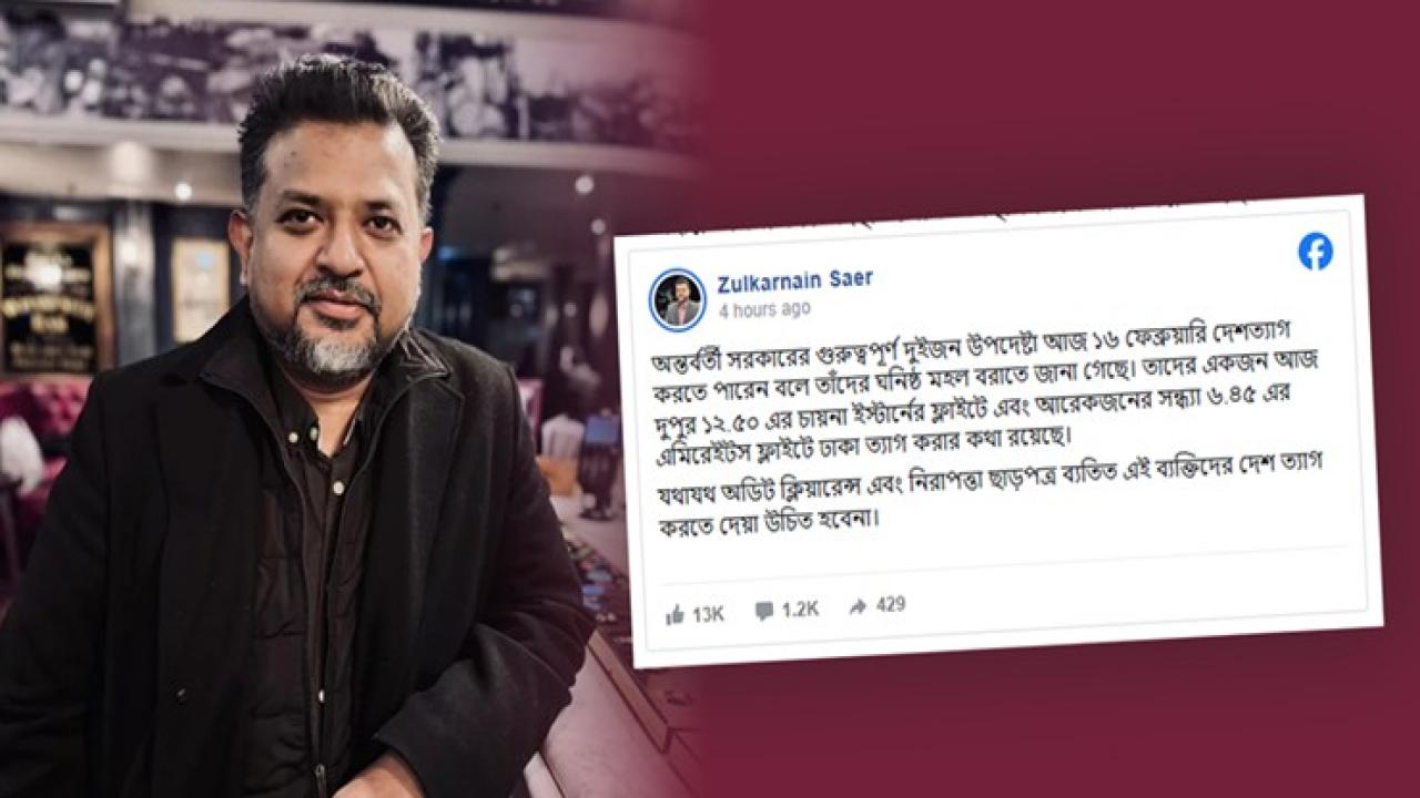 সোমবার (১৬ ফেব্রুয়ারি) সকালে নিজের ভেরিফায়েড ফেসবুক পোস্টে তিনি উল্লেখ করেন, উপদেষ্টাদের ঘনিষ্ঠ সূত্র থেকে প্রাপ্ত তথ্যানুযায়ী একজন দুপুর ১২টা ৫০ মিনিটে চায়না ইস্টার্ন এয়ারলাইন্সের একটি ফ্লাইটে এবং অপরজন সন্ধ্যা ৬টা ৪৫ মিনিটে এমিরেটসের একটি ফ্লাইটে ঢাকা ত্যাগের প্রস্তুতি নিয়েছেন। নিরাপত্তাজনিত কারণ দেখিয়ে তিনি তাদের নাম প্রকাশ করেননি।