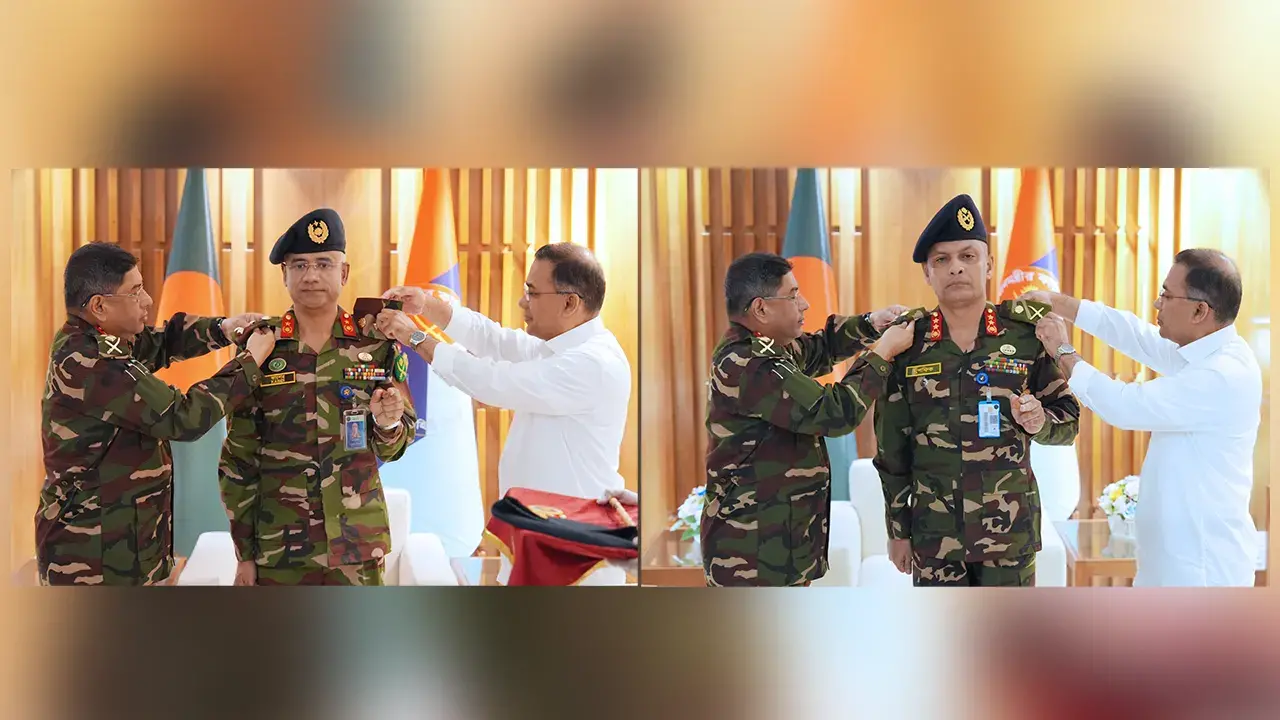 রাষ্ট্রীয় আনুষ্ঠানিকতার মধ্য দিয়ে পদোন্নতিপ্রাপ্ত দুই জ্যেষ্ঠ সেনা কর্মকর্তাকে নতুন র্যাঙ্ক ব্যাজ পরিয়ে দিয়েছেন প্রধানমন্ত্রী তারেক রহমান।