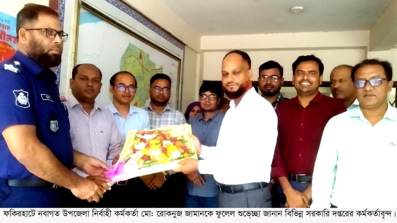 ফকিরহাটে নতুন উপজেলা নির্বাহী কর্মকর্তা মো: রোকনুজ জামানকে বৃহস্পতিবার (৯ এপ্রিল) উপজেলা বিভিন্ন দপ্তরের সরকারি কর্মকর্তারা ফুলেল শুভেচ্ছা জানান।