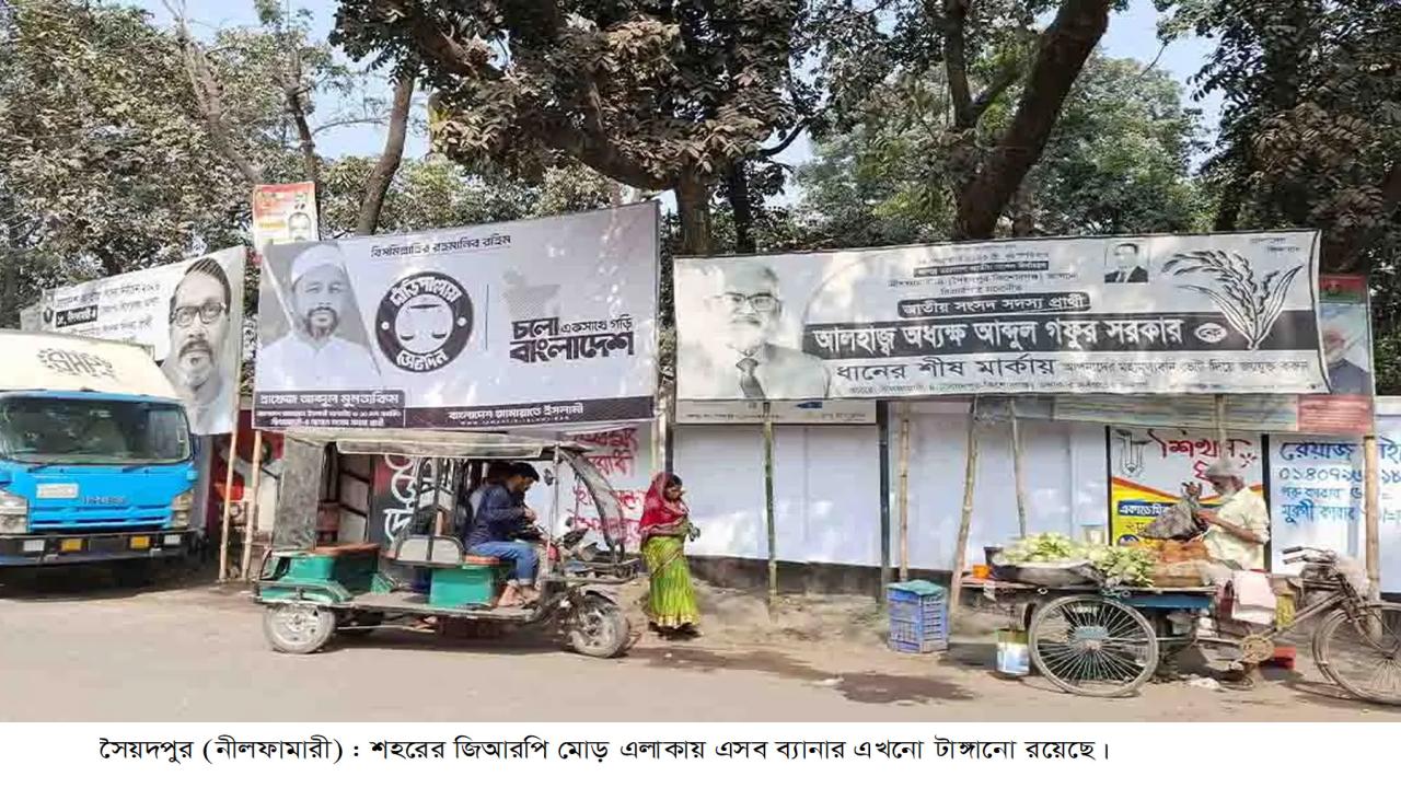 ত্রয়োদশ জাতীয় সংসদ নির্বাচনের পরেও সৈয়দপুর পৌর এলাকায় বিভিন্ন সড়ক, পাড়া-মহল্লা ও গুরুত্বপূর্ণ স্থানে নির্বাচনী পোস্টার, ব্যানার ও ফেস্টুন ঝুলে আছে। অনেক জায়গায় এগুলো ছিঁড়ে রাস্তায় পড়ে বা গাছ ও বিদ্যুতের খুঁটিতে ঝুলে থেকে নগর সৌন্দর্য ও পরিবেশের জন্য ঝুঁকি সৃষ্টি করছে।