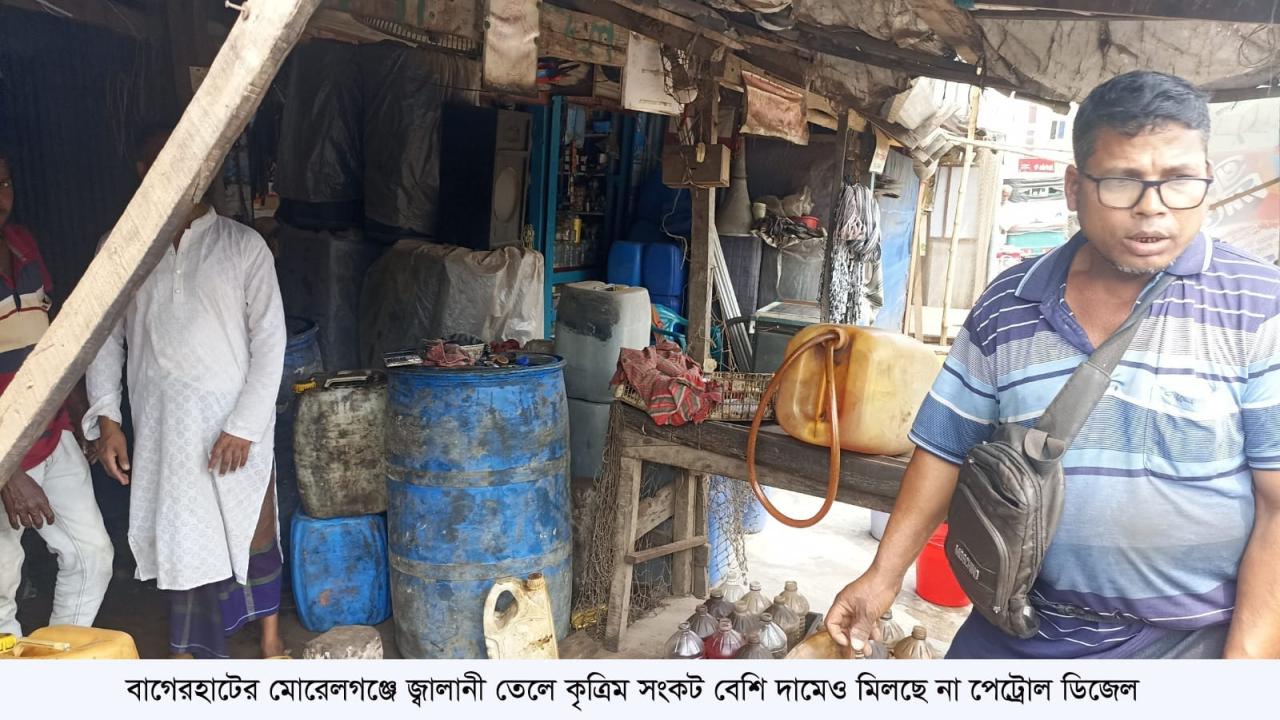 বাগেরহাটের মোরেলগঞ্জে জ্বালানি তেল পেট্রোল, ডিজেল ও অকটেলের কৃত্রিম সংকট সৃষ্টি হয়েছে বলে অভিযোগ উঠেছে। গত এক সপ্তাহ ধরে উপজেলার বিভিন্ন এলাকায় তেল সংকটে পড়েছেন ক্রেতারা। নির্ধারিত দামের চেয়ে বেশি দামেও মিলছে না পেট্রোল ও ডিজেল। ফলে কৃষিকাজে ব্যবহৃত যন্ত্রপাতি, নৌযান ও সড়কপথের যানবাহন চালাতে সমস্যায় পড়েছেন সাধারণ মানুষ।
